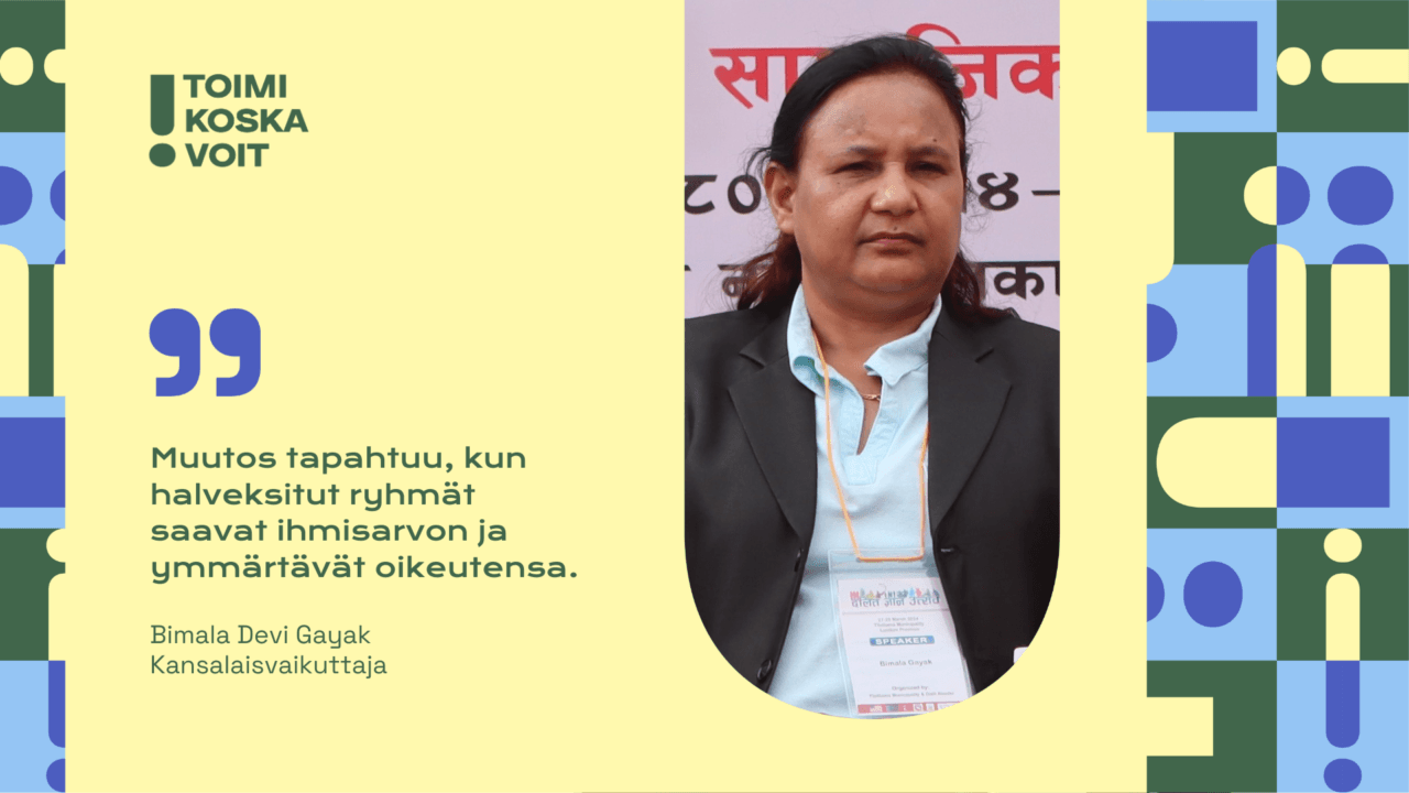 Nepalilainen Bimala Gayak on kohdannut kastisyrjintää lapsesta saakka. Hän kasvoi kansalaisvaikuttajaksi. Bimalan vanhemmat olivat perinnemuusikoita, jotka kiertelivät kylissä esittämässä tekemiään lauluja. Nämä laulut käsittelivät maattomien, usein ylisukupolvisessa velkaorjuudessa elävien dalitien kokemia päivittäisiä haasteita.