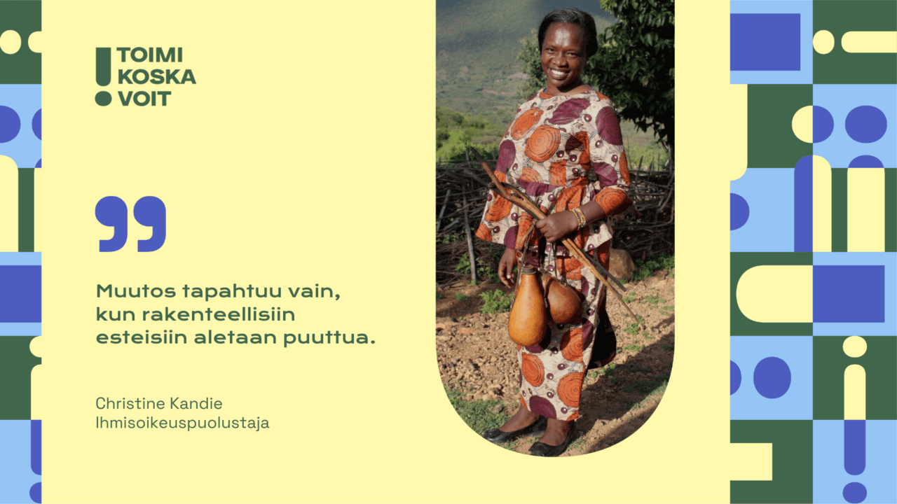 ”Aloitin kansalaisvaikuttamisen vuonna 2008, jolloin liityin endorois-kansan kampanjaan ja kamppailuun maaoikeuksistamme. Seurasin yhteisömme vanhimpien nimittämänä henkilönä valituksemme käsittelyä Afrikan ihmisten ja kansojen oikeuksien komissiossa ja raportoin sieltä takaisin endorois-yhteisölle”, sanoo Christine Kandie.