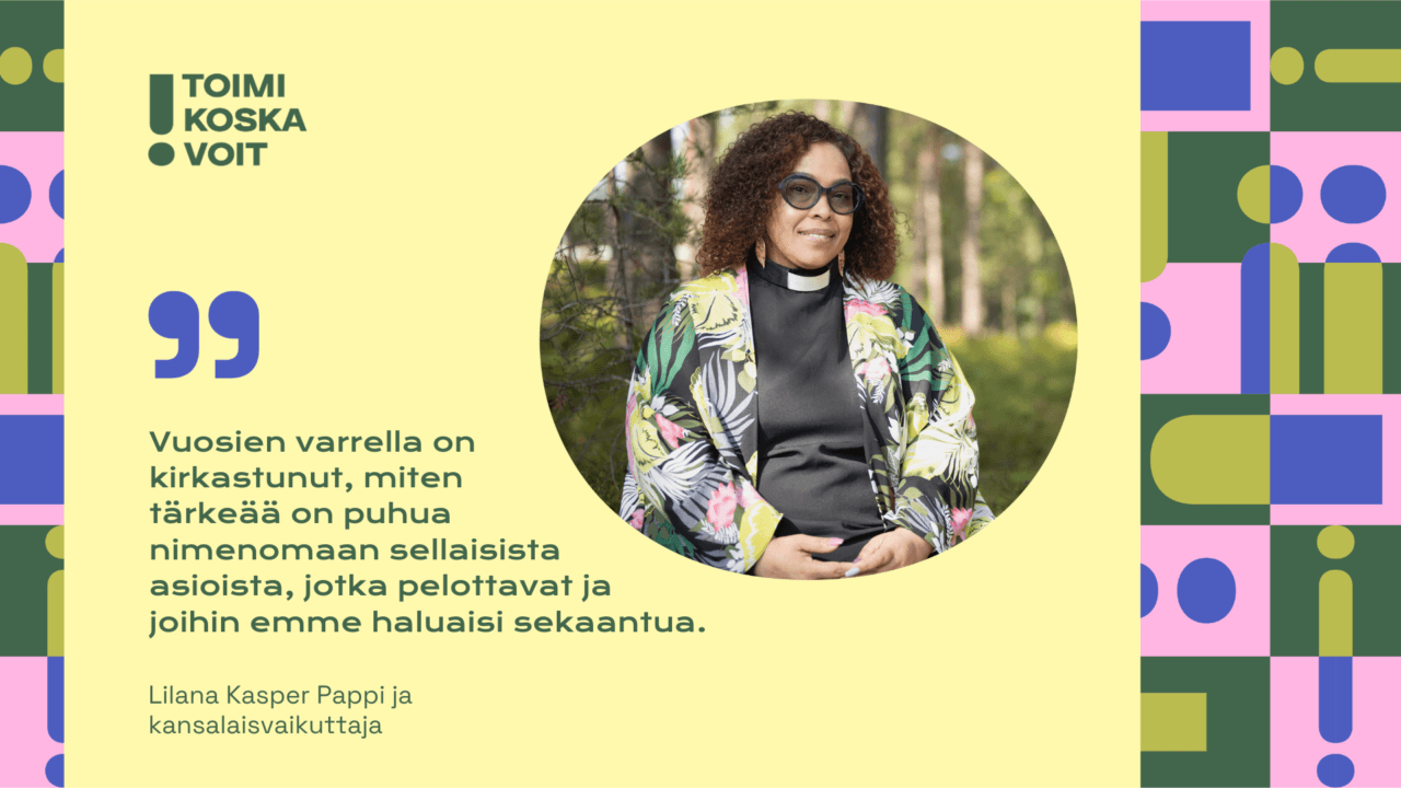 ”Vuosien varrella on kirkastunut, miten tärkeää on puhua nimenomaan sellaisista asioista, jotka pelottavat ja joihin emme haluaisi sekaantua.”