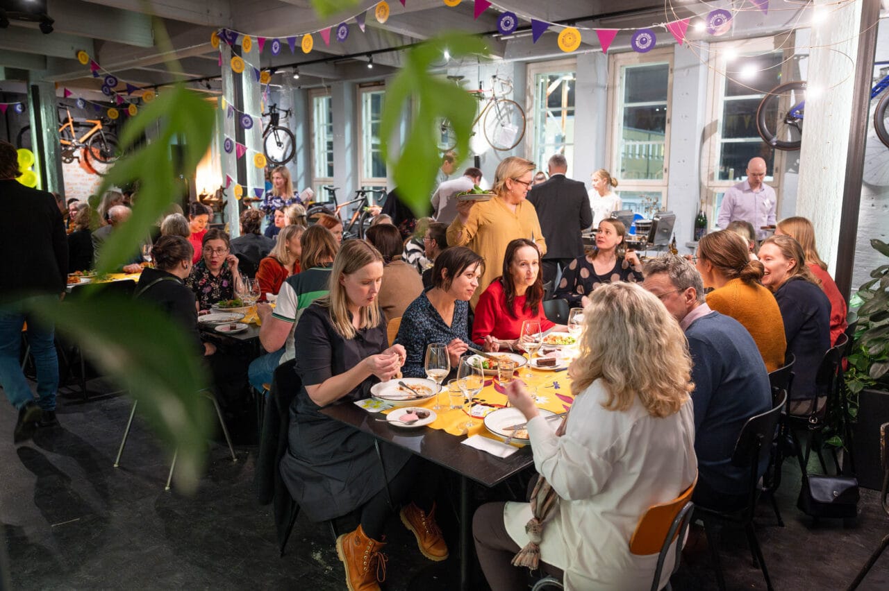 Syyskokouksen jälkeen väkeä alkoi virrata viereiseen Peloton Eatery -ravintolaan juhlistamaan Fingon 5-vuotispäivää.