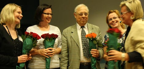 Kepan syyskokouksessa kukitettiin uudet varapuheenjohtajat Anu Juvonen (vas.) ja Anja Malm sekä väistyvä puheenjohtajisto Seppo Kalliokoski, Terhi Lindqvist ja Gunvor Kronman. Tuore puheenjohtaja Markku Niskala lähetti videotervehdyksen Nairobista.