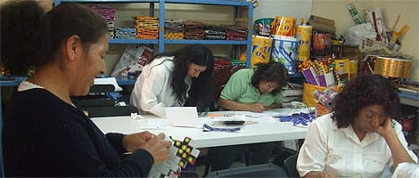 Conchita Martínez (seisomassa) ja muut Mitz-osuuskunnan naiset valmistavat tuotteita käytetyistä käärepapereista.