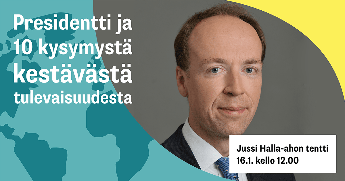 Nyt on aika esittää presidenttiehdokas Jussi Halla-aholle kymmenen kysymystä kestävästä tulevaisuudesta – tervetuloa seuraamaan yksilötenttiä tiistaina 16. tammikuuta kello 12. Kaikille avoin tilaisuus järjestetään laadukkaana verkkolähetyksenä Youtuben välityksellä.