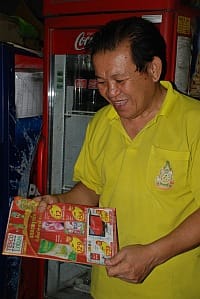 ”Katso tätä hintaa, vain 129 bahtia (vajaat 3 euroa)!”, pikkuisen juomakojun pitäjä Wallop Khongsamathai osoittaa Tesco Lotuksen mainoslehtistä Rangsitin tuoretorilla Bangkokin reunalla.