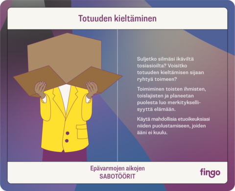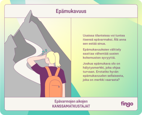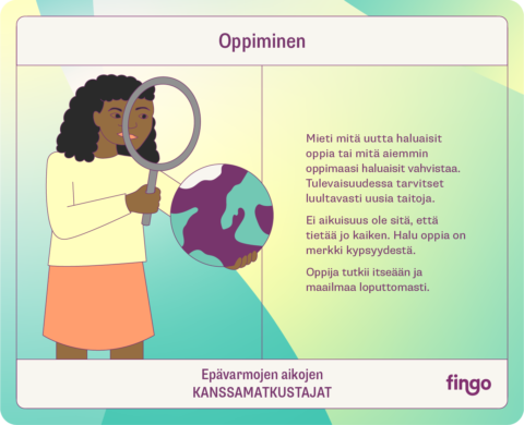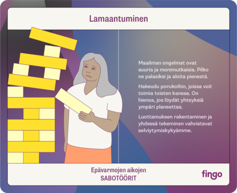 Maailmamme on epävarmuutta ja suuria kysymyksiä täynnä. Emme tiedä mitä seuraavaksi tapahtuu, ja se voi tuntua pelottavalta. Parempi tulevaisuus syntyy kuitenkin joka päiväisin teoin. Käytä matkakumppanikortteja tutkiaksesi, mitkä ominaisuudet ja taidot auttavat suunnistamaan epävarmuuksien aallokoissa ja sabotööri-kortteja tunnistaaksesi toiminnan esteitä. Tulevaisuuden hyödyntäminen on helpompaa, kun uskaltaudumme ottamaan epävarmuuden matkakumppaniksemme.