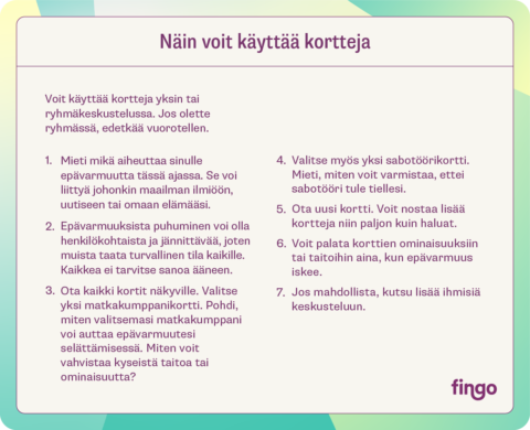 Tämä on digitaalinen korttipakka ja työkirja, jota voit käyttää niin kasvatustyössä, vapaaehtoistoiminnassa, kuin ystävien kesken. Kaikki kortit ja työkirja ovat ladattavia pdf-tiedostoja. Korttipakka sisältää ohjekortin, jonka avulla pääset alkuun. Työkirjaa voi täyttää omaan tahtiin tai ottaa mukaan vaikkapa oppitunnille, tapahtumaan tai työpajaan. Lataa työkirja täältä.